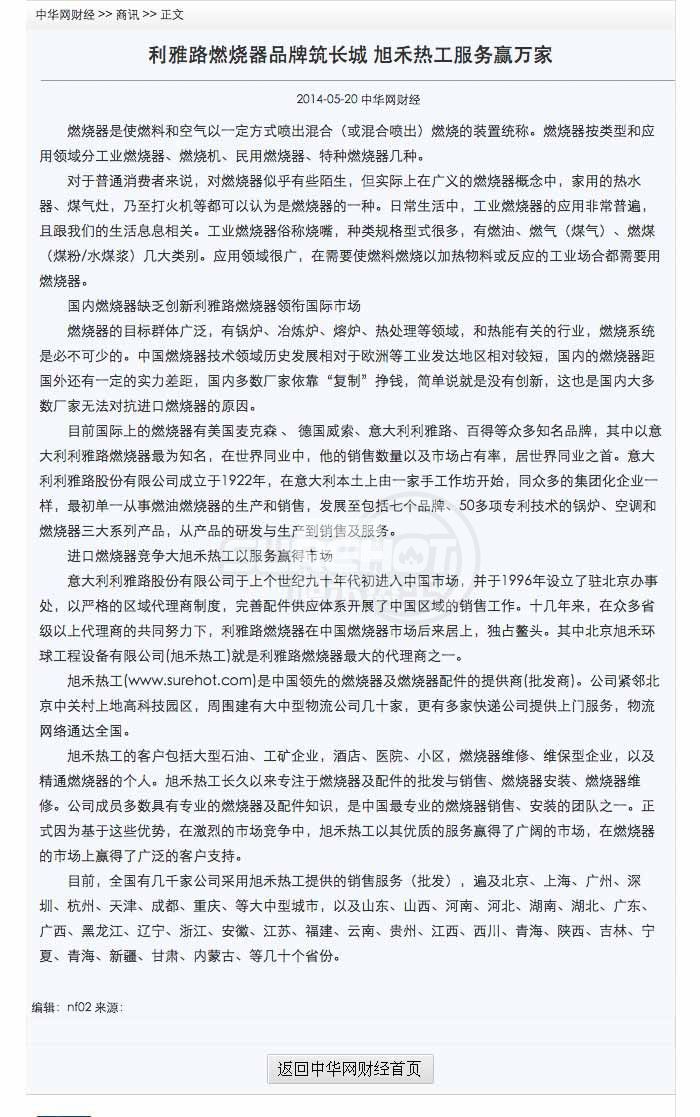 意大利利雅路股份有限公司于上個世紀九十年代初進入中國市場,并于1996年設立了駐北京辦事處,以嚴格的區域代理商制度,完善配件供應體系開展了中國區域的銷售工作。十幾年來,在眾多省級以上代理商的共同努力下,利雅路燃燒器在中國燃燒器市場后來居上,獨占鰲頭。其中北京旭禾環球工程設備有限公司(旭禾熱工)就是利雅路燃燒器的代理商之一。