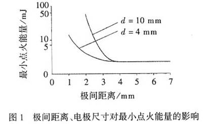 當(dāng)電極間距大于臨界距離時(shí),比較小點(diǎn)火能量與電極間距無(wú)關(guān);而當(dāng)電極間距小于臨界距離時(shí),由于電極本身的吸熱,比較小點(diǎn)火能量隨電極間距的減小而增加。圖1為比較小點(diǎn)火能量與電極間距、電極尺寸的關(guān)系曲線,燃料為11%的甲烷空氣混合氣體。