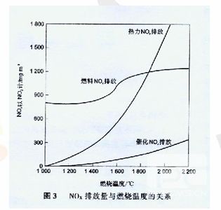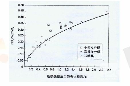 我國目前水泥回轉窯的Nox排放量大都超過0.1%,高的超過0.2%,而一些先進國家已控制在0.02%-0.04%以下。燃燒過程中Nox排放分3種類型,即熱力Nox排放、燃料Nox排放和催化Nox排放,三者與燃燒溫度的關系見圖3。由于窯頭火焰溫度高達1800℃左右,熱力Nox占主要地位(當燃料中含有碳氫化合物時,會在較低溫度下出現催化Nox排放)。減少窯頭Nox排放的主要途徑在于一方面應盡量降低火焰的峰值溫度,避免局部高溫,這往往和強化燃燒概念相矛盾,需要對火焰各階段的二次風混合速率進行控制;另一方面應控制局部氧濃度,特別是對燃燒器出口至著火這一階段的氧濃度控制。圖4中高揮發分煙煤、中等揮發分煙煤和石油焦的著火溫度依次升高。在相同受限射流火焰中,三者距燃燒器出口的著火距離依次是石油焦>中等揮發分煙煤>高揮發分煙煤,其Nox排放量大小依次是石油焦>中等揮發分煙煤>高揮發分煙煤。